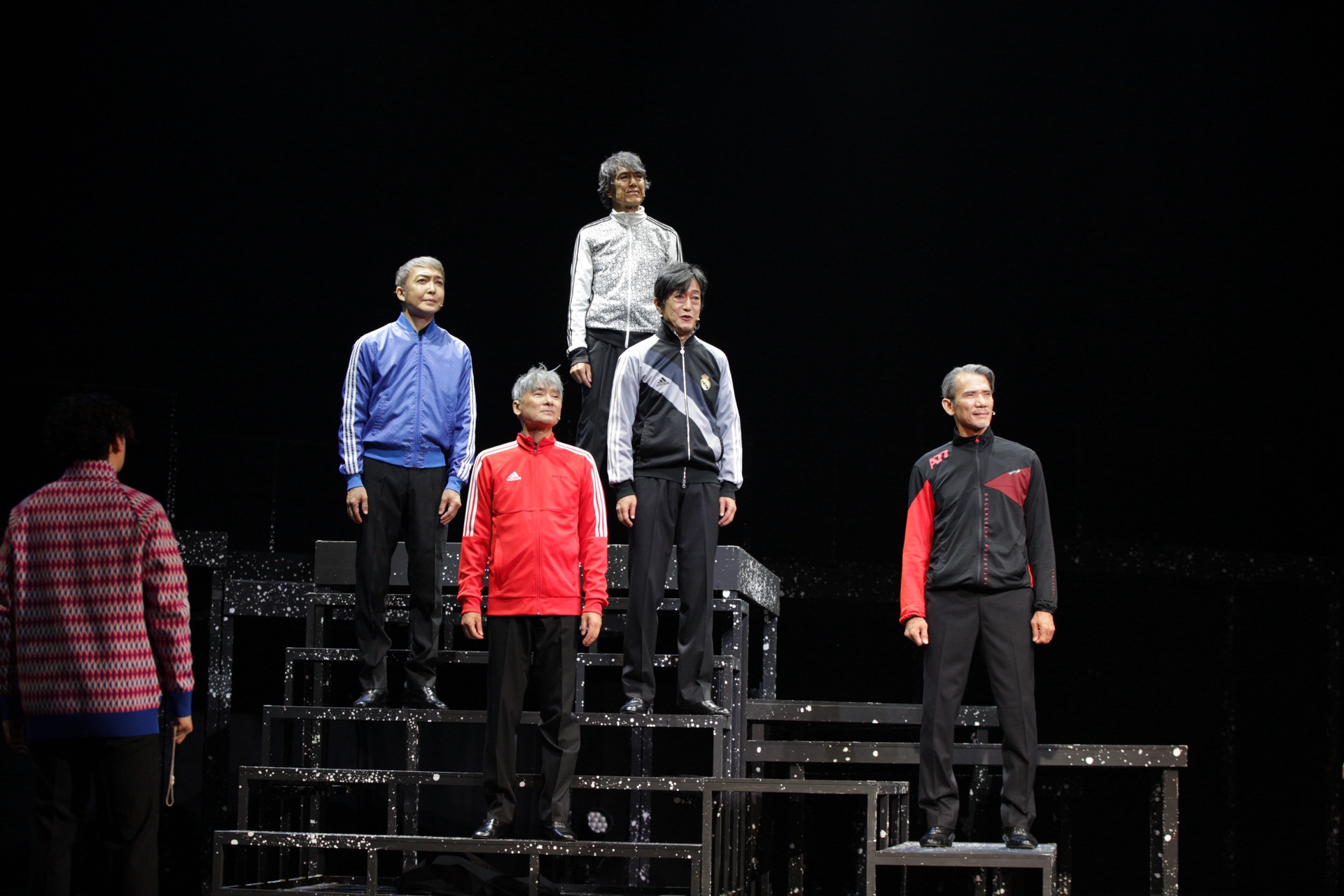 THE CONVOYのオリジナルメンバー5人が集まり、わいわいとお酒を飲むシーンから公演がスタート。お祭り感満載なオープニングナンバーで客席を盛り上げたあと、5人が若手たちの劇団のオーディションに参加する物語に入っていく。ジェネレーションギャップを感じさせるコミカルなやり取りの中でも、一人ひとりの個性とスキルの高さが見えるのが楽しい。それぞれが確かな実力を持っているからこそ、悪ふざけのようなギャグやドタバタでも安定感があり、笑いながら見ることができる。