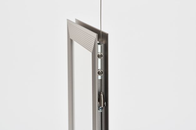 背面ではなく側面の中心に吊り元を収めることで、斜めに「おじぎ」する状態がおきないように設計されたアルミ製の額縁。側面の中心から吊る構造のため、額を縦に連結した状態でも「おじぎ」せずに展示することも可能。吊り金具などの露出も少ない点や、フラットな面と、線状に凹凸が入った面の両面が使える拡張性などを評価した。