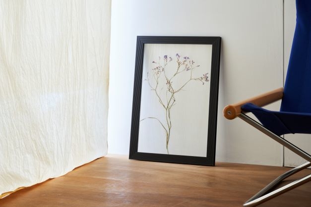 縁から内側に向かってささやかにつけられた斜面がシャープな陰影を作る額縁。斜面は額縁と作品の段差も薄くし、作品と額の一体感も与えている。一見するとシンプルな形状でありながら、よく見ると斜面の微妙な角度の検討や継ぎ目の精度、Rの加減など細かな点に配慮がなされており、プロダクトとしての解像度を高めている。