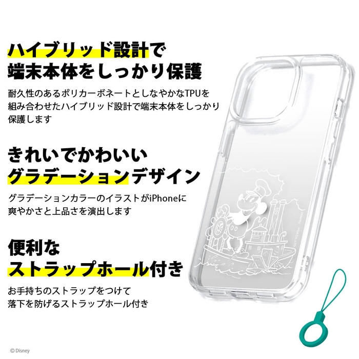 背面はクリアデザインでiPhone本体の美しさを最大限に活かします。耐久性のあるポリカーボネイトとしなやかなTPUを組み合わせたハイブリッド設計で端末本体をしっかり保護します。お手持ちのストラップをつけて落下を防げるストラップホール付き。