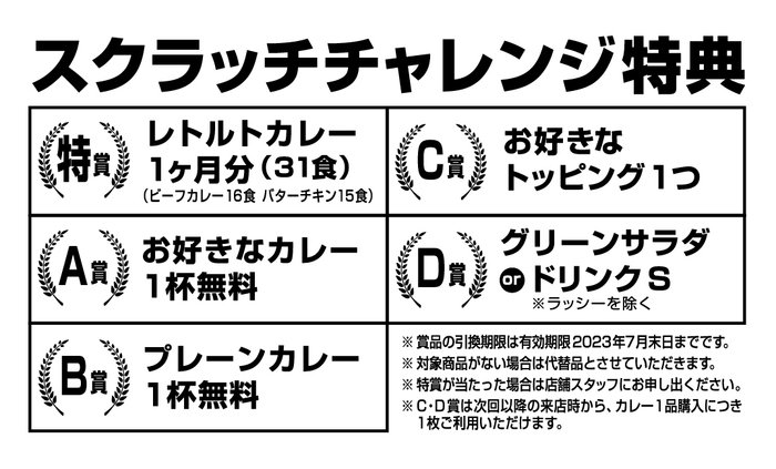 カレー1皿ご注文につきスクラッチカード(はずれなし)を1枚配布いたします。