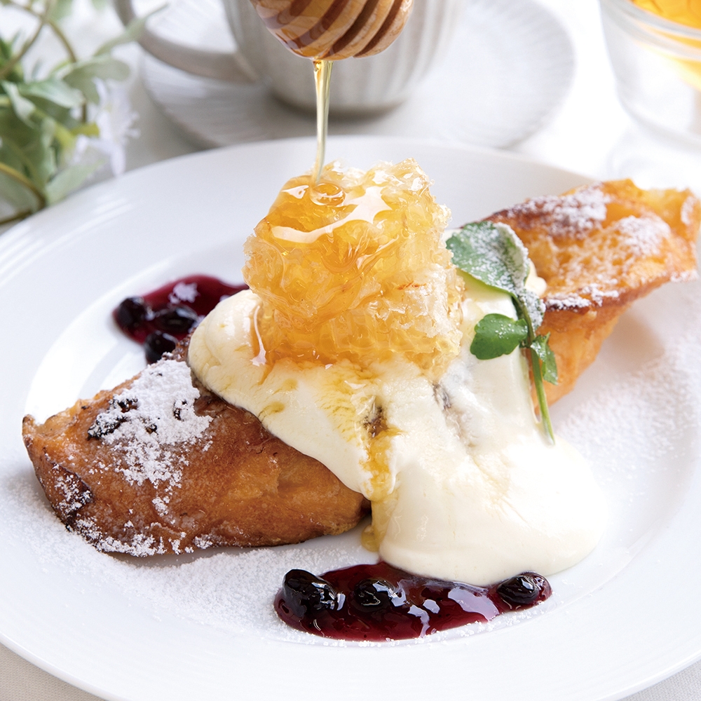 デザートは「生はちみつとマスカルポーネのフレンチトースト」(巣蜜R:980円)が1番人気。目の前でスタッフが巣蜜を炙って溶かすパフォーマンスもございます。
