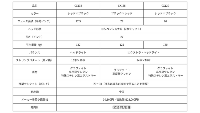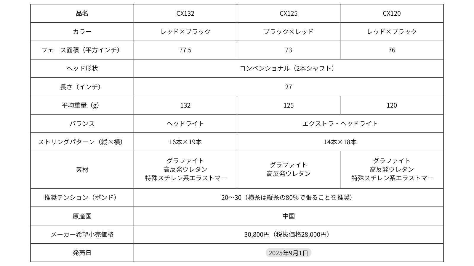 「CX」シリーズは、プレーヤーが日々のトレーニングで培った技術をコート上で最大限に発揮できるよう、コントロール性とタッチ性能の向上を追求して開発されました。楕円型ヘッドに2本シャフトの伝統的な形状を採用することで、優れたコントロール性能を実現しました。プレーヤーが意図するショットをより正確に、自信を持って繰り出せるようサポートします。メーカー希望小売価格は、3機種とも30,800円(税抜価格:28,000円)です。