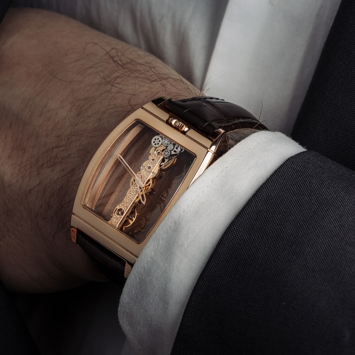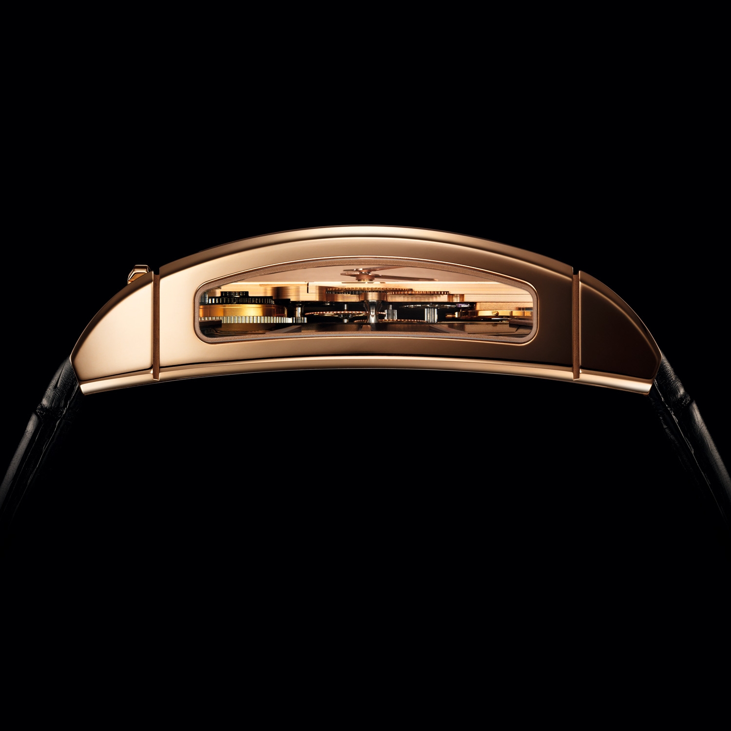 オリジナルのバゲット型ムーブメントを搭載。ムーブメントをどの角度からも鑑賞できるように、ケースの表・裏・側面をサファイアクリスタルガラスで作り上げています。