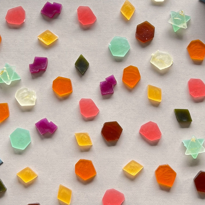 砂糖と寒天からできた和菓子の一種、琥珀糖。