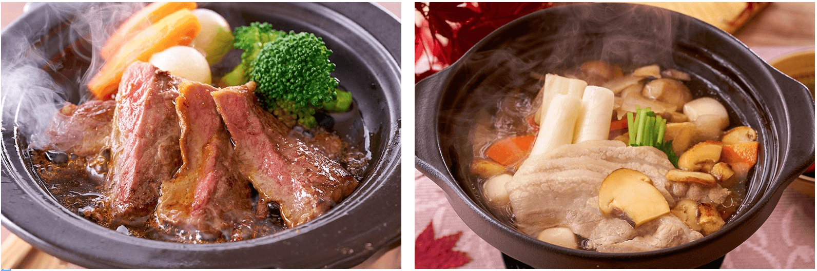 サーロインステーキの陶板焼きや、秋の食材を使った小鍋や釜飯など、卓上で仕上げて熱々をお楽しみいただく料理がずらりと並ぶかもしか荘のバイキング。少しずつ気温が下がる山の宿ならではのご馳走でおもてなしいたします。