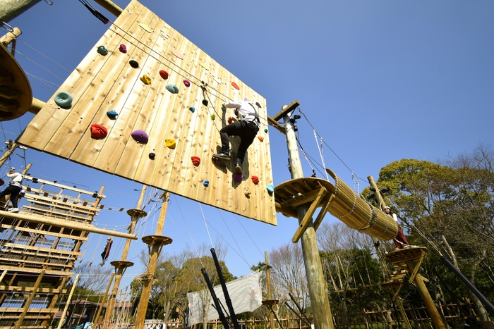 アスレチック「アッパレ!戦国大冒険!」初級コースのボルダリングゾーンのホルダーが変更。映画「クレヨンしんちゃん もののけニンジャ珍風伝」に登場した「タコ・カメ・ゴリラ」をイメージした可愛いホルダーが登場したり、踏むと音が鳴る仕掛けを追加、などさらに可愛く難しくなった初級コースを体験できる