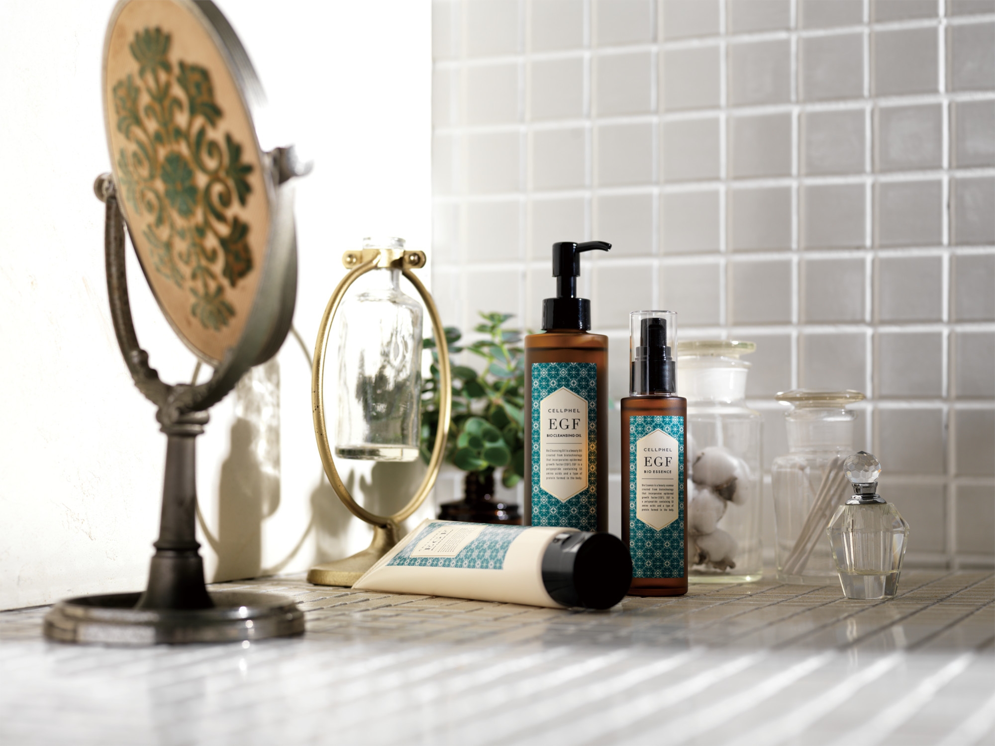 また、セルフィルの象徴である幾何学模様は、EGF・アミノ酸・タンパク質・DNA・化学式をモチーフにし、オリジナルパターンを考案しました。科学的な記号をそのまま使用するのではなく、アラベスクを連想させる優雅な幾何学柄に落とし込むことで、無機質さや冷たさを排除し、ブランドの目指す、華やかな雰囲気と世界観を表現しました。