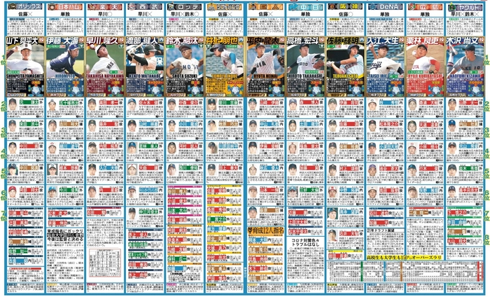 今年もA1サイズのドラフト選手名鑑を収録。支配下選手は顔写真入り。さらに1位指名の選手は野球カード型のプロフィールで紹介。すべてカラーで掲載していますので、保存にも最適です。