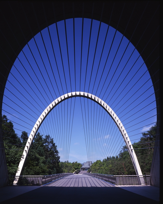枝垂れ桜のプロムナードを通り、銀色に輝くトンネルをくぐると、吊り橋の向こうに美術館棟が現れる設計は、中国詩に描かれた桃の花に導かれ洞窟を抜けた先に現れる楽園「桃源郷」をテーマにしています。