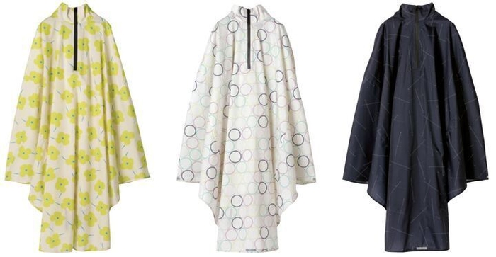 バックパックを背負ったままの着用も可能、オシャレなクロスバイク・ロードバイクには「レインバイシクルポンチョ」(写真右)、荷物が濡れないよう、レインポンチョを自転車のカゴにサッとかぶせる「チャリーポンポン」(写真左)。「レインバイシクルポンチョ」は今季登場。