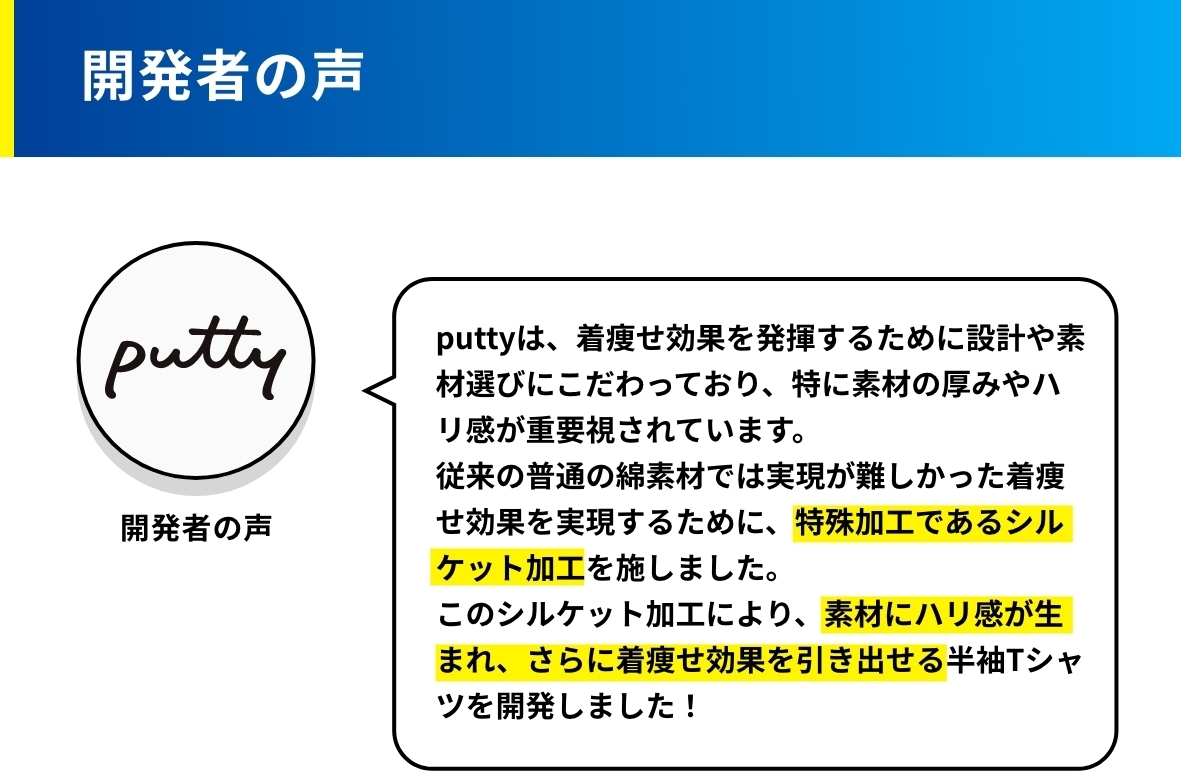 現在、Puttyは綿100%のTシャツをはじめ、トルードライのTシャツ、ロングTシャツ、ビジネスでもカジュアルでも着用できる長袖Yシャツ、ビジネスシーンでの利用を想定した半袖Yシャツなど、様々なアイテムを展開しています。例外なく全て全面のみ二重になっているため、全てのシーンで体型や乳首透けを気にせず着用いただけます。