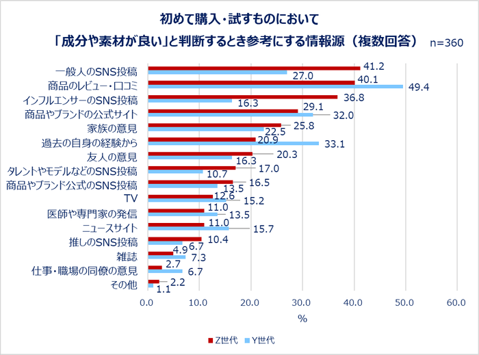 成分や素材をチェックする人たちは、どんな情報源を参考に判断しているのでしょうか。Z世代は「一般人のSNS投稿(41.2%)」「インフルエンサーのSNS投稿(36.8%)」と回答した人が目立ち、やはりSNSをよくチェックしていることがうかがえます。「商品のレビュー・口コミ(Z世代:40.1%、Y世代:49.4%)」は、Z世代・Y世代共に比較的多くの人が活用していると分かりました。Y世代は「過去の自身の経験から(33.1%)」と回答した人も3割以上いました。