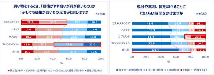 質を求めるとき、比例して高くなりやすい「価格」。見た目や味には差がないとき、「価格がやや高いが質が良いもの」か「少しでも価格が安いもの」どちらを選ぶか聞いてみたところ、およそ半々という結果に。カテゴリとしては「コスメ・スキンケア」は質の良さを取る人が、「ファッションアイテム」は価格の安さを取る人がやや多いようです。成分や素材、質を調べることにどれくらい時間をかけているかも商品カテゴリ別で聞いたところ、約半数が数十分~数時間程度と、その日のうちに検討を終えていることが分かりました。時間をかけている人が比較的多いのは「サプリメント」、少ないのは「食べ物」でした。