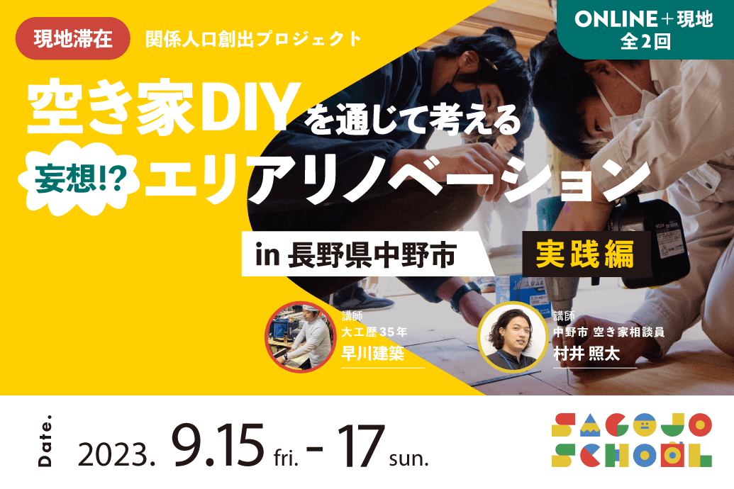 そこで長野県中野市と株式会社SAGOJOがコラボレーション。空き家DIYとまちづくりを学ぶ「空き家DIYを通じて考えるエリアリノベーション」を開催します。
