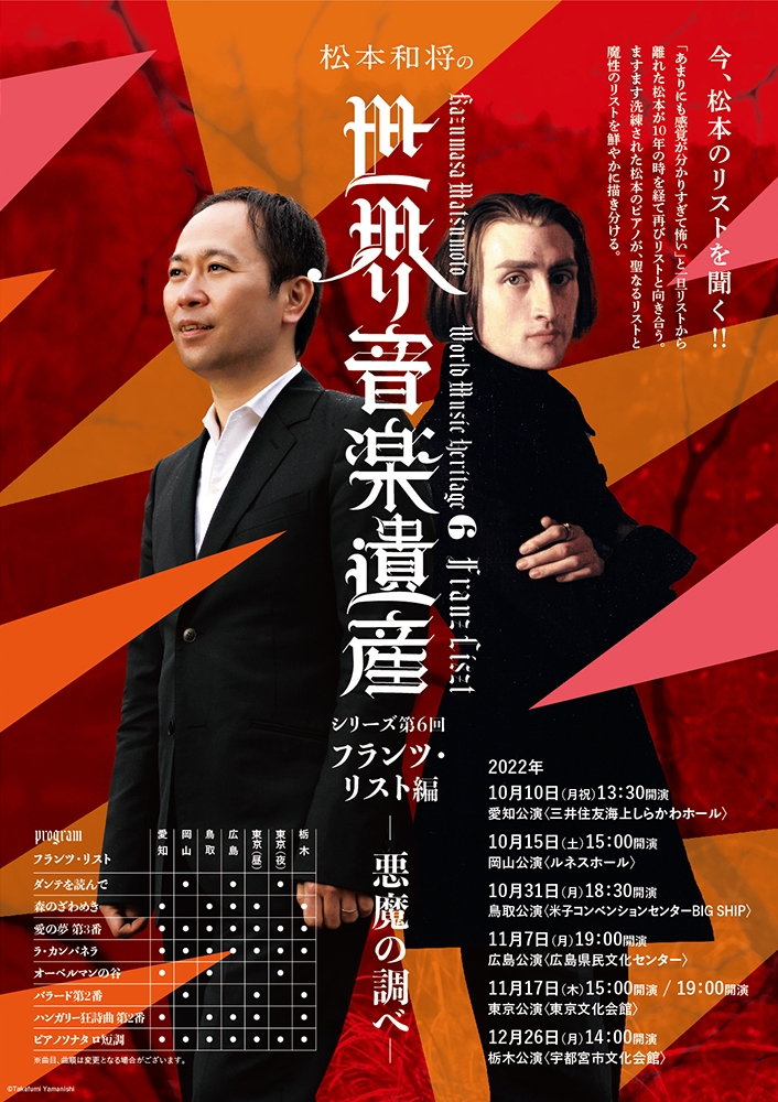 世界音楽遺産実行委員会主催(岡山公演除く)、『松本和将の世界音楽遺産 シリーズ第6回 フランツ・リスト編-悪魔の調べ-』が全国6都市にて開催されます。
