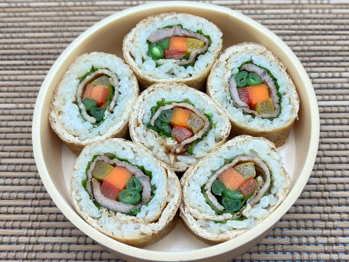 自家製の甘辛ダレで漬け焼きにした豚肉とサンチュ、赤パプリカ、黄パプリカ、ニンジン、インゲンの5種類の野菜を酢飯とともにお揚げで巻き上げました。甘さひかえめのお揚げと自家製ブレンドのすし酢を使用した酢飯が肉巻きの甘辛ダレと相性抜群!5種類の野菜とともにヘルシーに召し上がっていただけます。