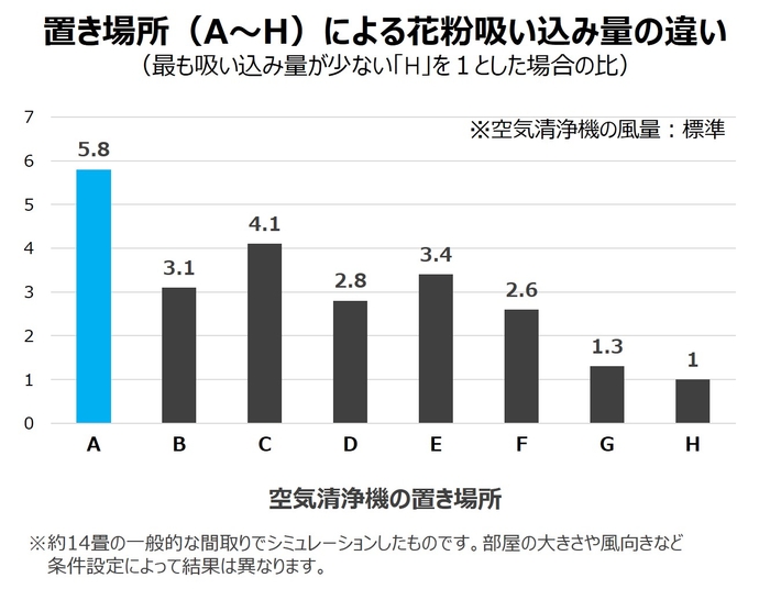 同じ部屋でも、置き場所によって花粉吸い込み量に5倍以上の差!