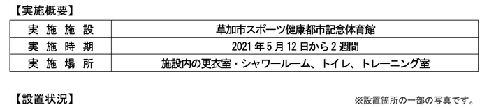 設置場所:草加市スポーツ健康都市記念体育館1Fトレーニング室、 2F男女更衣室・シャワールーム、トイレ等
