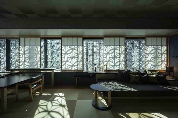 星のや東京の客室は、竹と栗の素材を使った調度品や太鼓張りの障子が特徴的な和室です。外観の麻の葉くずしの柄は、ゆるやかな時のうつろいを障子に映し出します。畳の空間に合わせた低い重心の「畳ソファ」や、オリジナル寝具でくつろげます。