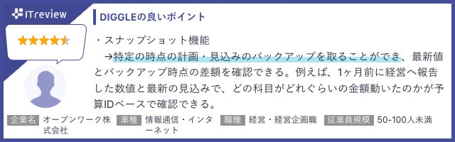 「DIGGLE」のご利用企業様からは、ITreviewにて以下のようなレビューをいただいています。(一部抜粋)