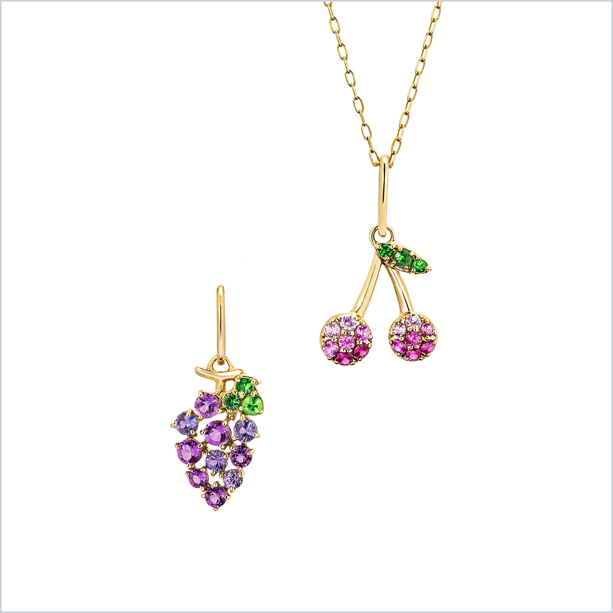 イチゴ、パイナップル、サクランボ、メロンは、ふっくらとした立体感のあるシルエットに仕上げ、ブドウは、色味の違う2種類のカラーストーンをセッティングすることで本物の実のような表情の違いを表現しました。別売りのネックレスチェーンに通すほか、お手持ちのチェーンやほかのジュエリーと組み合わせて使うなど、お好みのアレンジをお楽しみください。それぞれのモチーフにはポジティブな意味が込められており、お守りジュエリーとしてもおすすめです。
