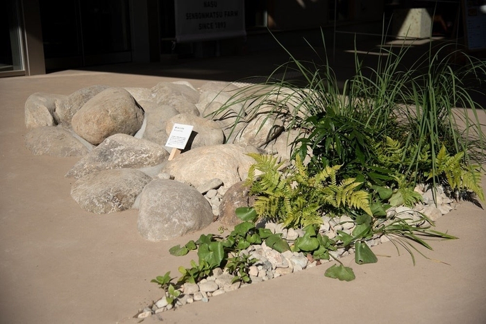 那須特有の扇状地の形成過程で含まれた石を掘り出し、レストラン入口にユニークなモニュメントを設置しました。