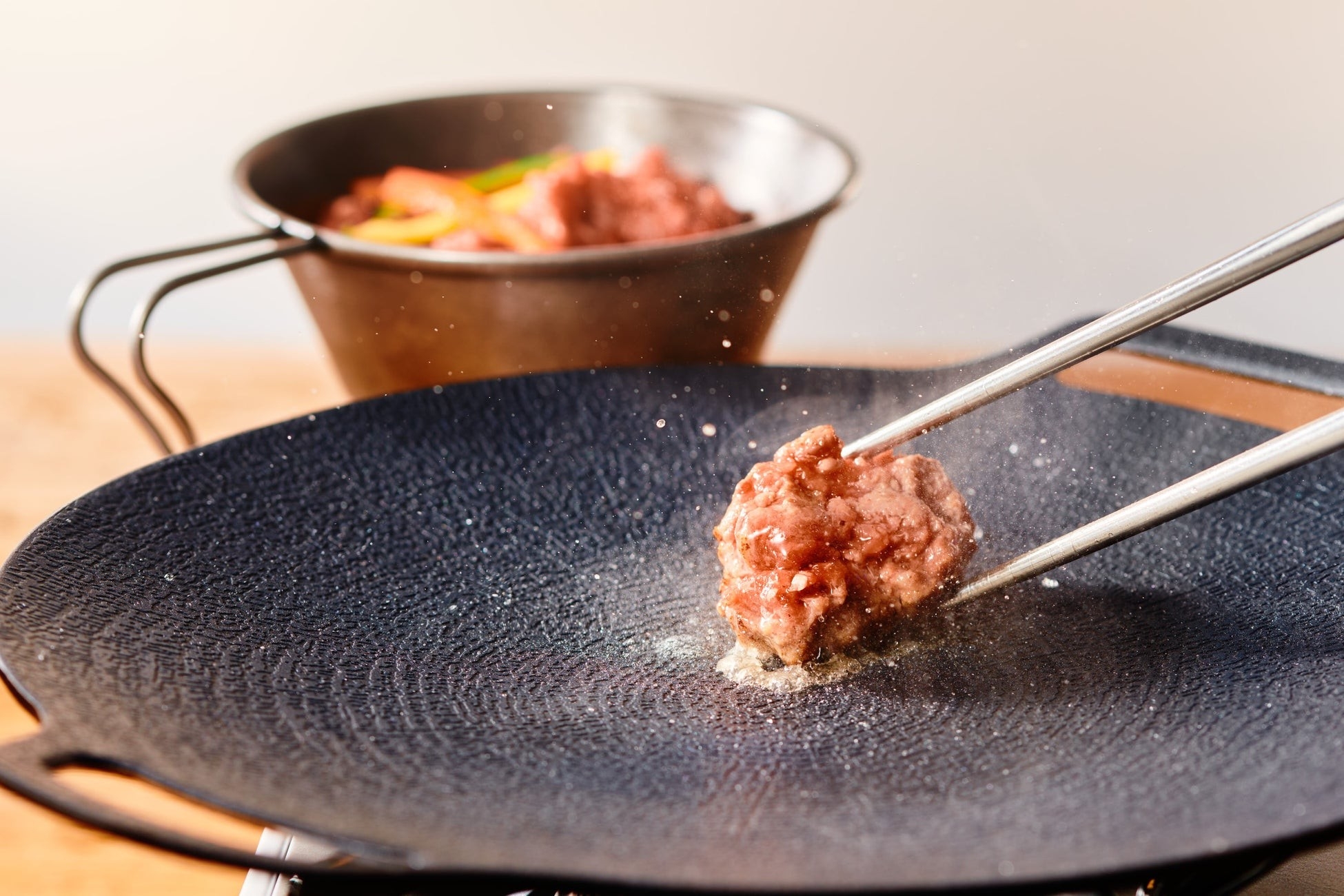 目の前の鉄板で一口サイズにカットし、ご自身で焼いてお召し上がりいただく、焼肉スタイルの新感覚ハンバーグです。焼きたてのジューシーな美味しさと、6種類のタレ・薬味(チミチュリソース・トマトソース・わさび・塩・ごま油・ポン酢)で多彩な味わいが楽しめます。