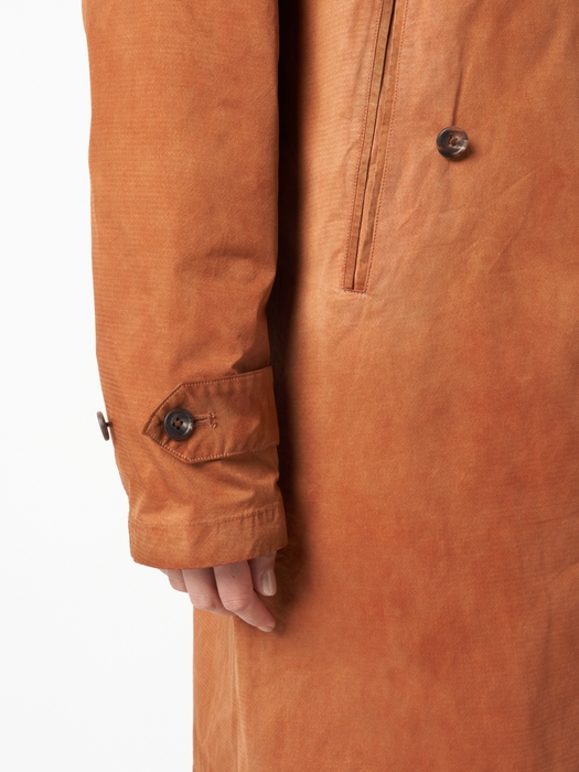 ヴィンテージレザーを思わせる美しいゆらぎを感じさせる上質なテクスチャーと、軽量・撥水・防風・パッカブルといったマルチな高機能性をもち、秋・春は軽量で軽やかに、冬は高い防風性であたたかく、雨季は簡易なレインウェアとして年間を通じて使用可能な高機能プレミアムアウターです。