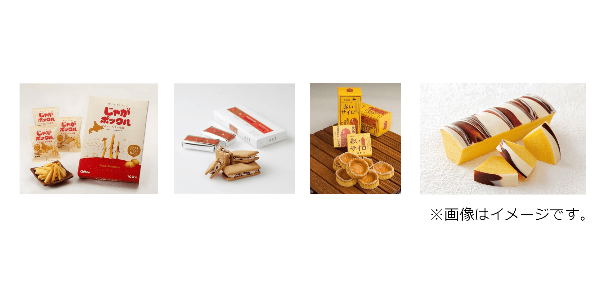 カルビー「じゃがポックル」や六花亭「マルセイバターサンド」などの人気菓子を、期間・数量限定でご用意いたします。