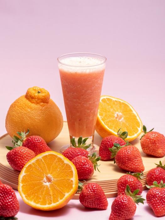 『生搾りデコポン』ジュースと併せて、大人気のいちご「あまおう」と「デコポン」をミックスした、デコポンの味わいとあまおうの香りと甘さを同時に楽しめる『あまおうデコポン』も販売いたします。淡いピンクの春らしい色合いが楽しめる、今しか味わうことのできない季節限定のジュースです。いちごも100g中62㎎とビタミンCを豊富に含む果物。そんないちごと旬のデコポンを合わせて美味しく摂取できる、カラダと心に嬉しい1杯です。
