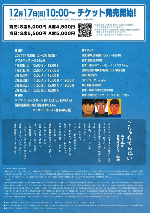 株式会社エンターアーツプロモーション/株式会社にゃんにゃんカムカム/株式会社ワタナベエンターテインメント主催、舞台「こりゃもてんばい4」が2024年1月30日(火)~2月4日(日)にベイサイドライブホール BY ACTIVE HAKATA(福岡県福岡市博多区築港本町13-6 ベイサイドプレイス博多A棟2階)にて上演されます。