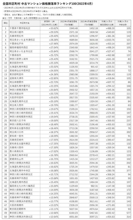 ■全国市区町村 中古マンション価格騰落率ランキング100(2022年4月)