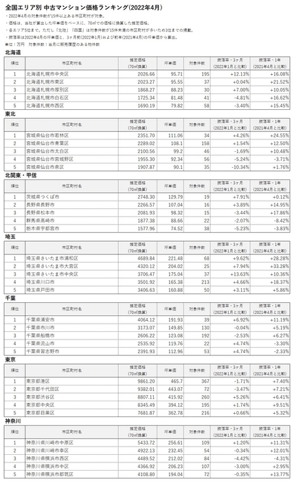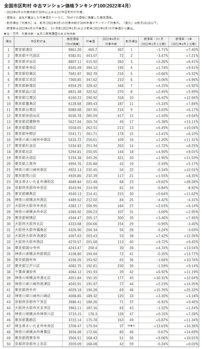 「マンションレビュー」2022年4月全国市区町村 中古マンション価格/騰落率ランキング100を発表