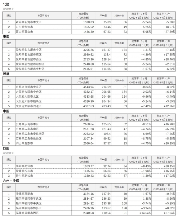 各エリア5位まで。ただし、「北陸」「四国」は対象件数が15件未満の市区町村が多いため3位まで掲載。
