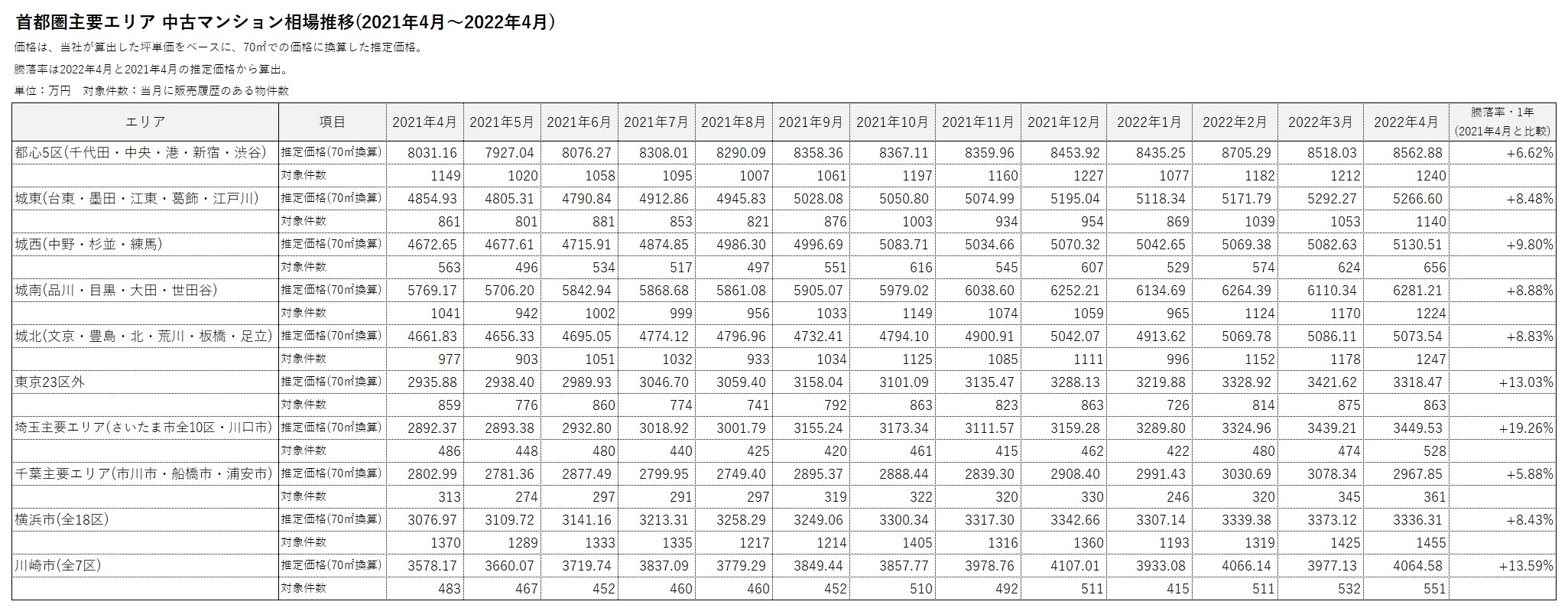 ・首都圏の主要エリアでの2022年4月の70㎡換算推定価格は、10エリア中5エリアで上昇し、5エリアで下落。