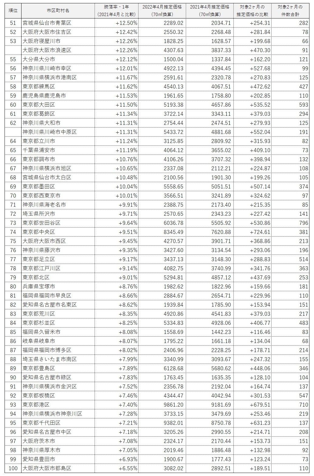 2022年4月と前年(2021年4月)の坪単価を比較して算出した「騰落率」のランキング。2022年4月と2021年4月の対象件数(当月に販売履歴のある物件数)がそれぞれ30件以上ある183市区町村が対象。価格は、坪単価をベースに70㎡での価格に換算した推定価格。
