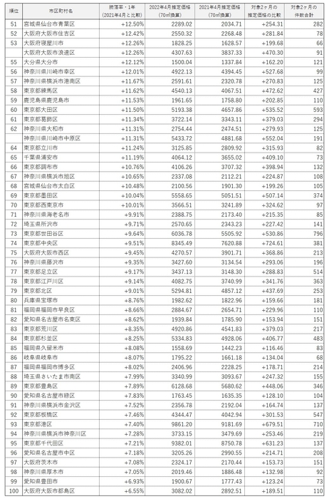 ・推定価格が100位以内の市区で、前年(2021年4月)と比較して価格が上昇したのは94市区。また、3ヶ月前(2022年1月)と比較して価格が上昇したのは65市区。