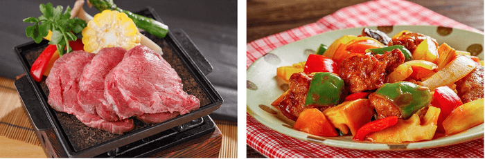 右:「宮城銘柄豚と彩り野菜の酢豚」。カラフルな夏野菜と旨味が溢れる銘柄豚を黒酢で仕上げた、ビールにもご飯にもぴったりの一品です。