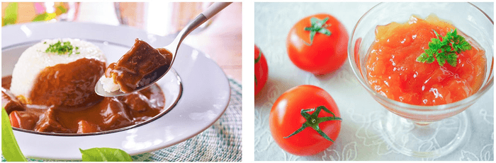 左:牛タンを使ったアレンジメニュー「ゴロゴロ角切りやわらか牛タンカレー」。食べ応えのある角切り牛タンですが、しっかりと煮込まれているため、口の中でホロホロととろける美味しさをお楽しみいただけます。