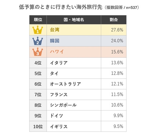 節約志向が続いていても、尽きることはない海外旅行への憧れ。低予算のときに行きたい海外旅行先として、次の国・地域が選ばれました。