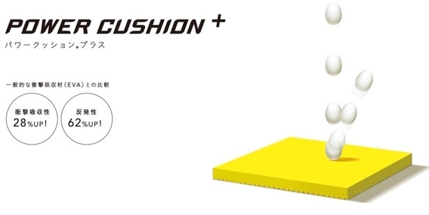 衝撃吸収性と反発性を併せ持つ「軽く、疲れにくい」衝撃吸収反発素材パワークッション。パワークッションに反発性の高い特殊樹脂を添加し、+型の溝を最適な間隔と深さで格子状に配置した新構造を採用した「パワークッションプラス」は、従来の軽量性を保ちつつ、衝撃吸収性を28%、反発性を62%アップさせ(一般的な衝撃吸収材[EVA]との比較)、12mの高さから落とした生卵が、割れずに6m以上跳ね返る新衝撃吸収反発素材です。