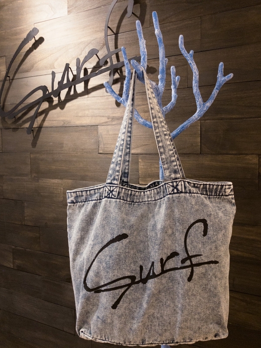 白い砂浜の波打ち際を連想させるカラーのデニムに、大きく「surf」のロゴがあるナチュラルな印象のバッグです。