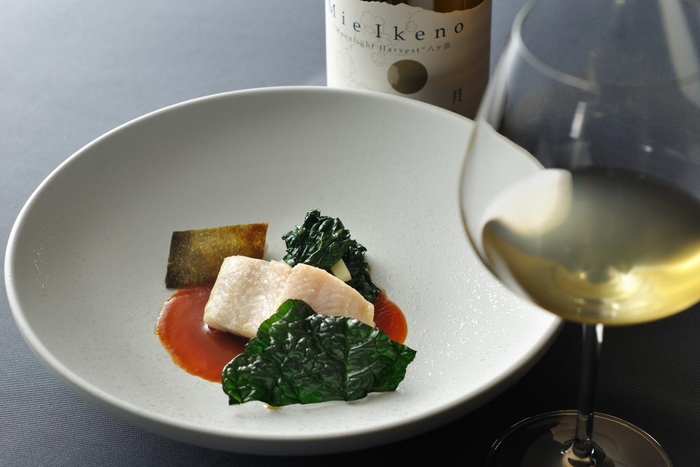 ワインのミネラル感となめらかなテクスチャーが、朴葉の香りをまとったイワナの味わいを引き立て、ソースのワタリガニの旨味に寄り添います。またワインの樽香がイワナの皮の香ばしさによく合う組み合わせです。
