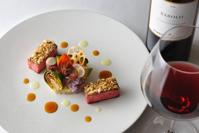 ワインの完熟した赤や黒の果実の濃厚なアロマと、レザー、タバコやスパイス、腐葉土のニュアンスの複雑な風味が、牛肉に添えるすりだねとパン粉の旨味にシンクロします。ワインが牛肉と味噌の旨味にまろやかに融合し、全体のハーモニーを生み出す組み合わせです。