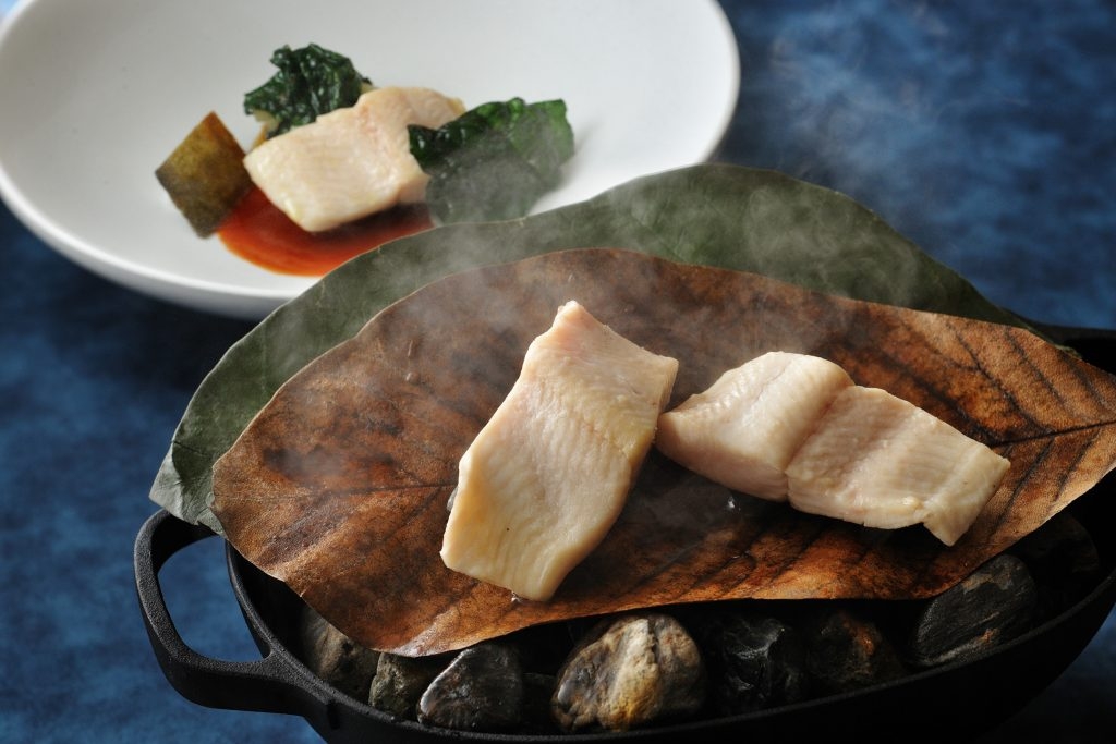イワナを朴葉とともに目の前で蒸し上げることで、ふっくらとしたイワナの味わいと朴葉の豊かな香りが楽しめる一品です。様々な魚介を使った濃厚なスープとカーボロ・ネロ(*4)やじゃがいもと合わせて提供します。
