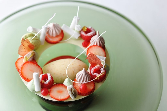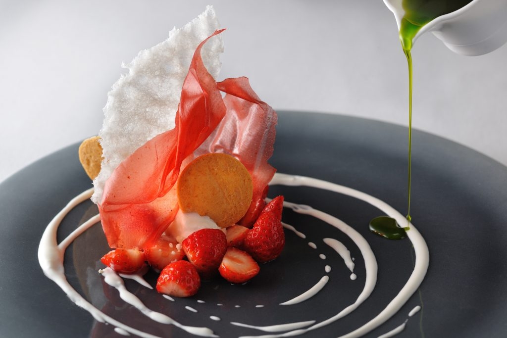 冬に甘味が増すイチゴに、マスカルポーネのソース、メレンゲのジェラートを合わせました。イチゴやミルクのチップとともに、軽やかに仕立てたトルタ(*7)です。アクセントにミントのオイルをかけると、イチゴとミントの清涼感がより楽しめます。