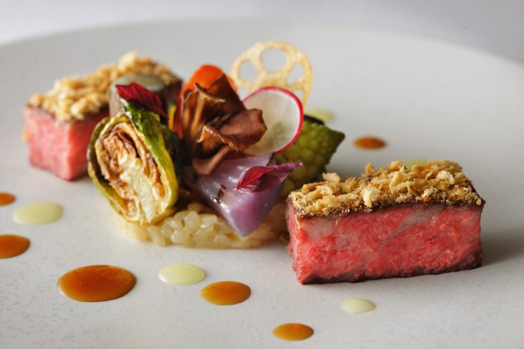 香ばしく仕立てた牛肉のグリルに、山梨郷土の薬味である「すりだね」を合わせました。すりだねと相性の良い味噌を効かせたソースが牛肉の味わいをさらに引き立てます。付け合わせには、チーズのリゾットと、冬が旬であるレンコン、ごぼう、人参などの野菜を添えました。じっくりと加熱することで根菜のほっくりとした味わいを楽しめます。