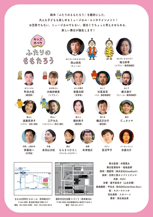そして演出を担うのは「一般社団法人プレイキッズシアター」代表のむらまつひろこ。大勢の子どもたちとの舞台創作経験が【キッズオペラ ふたりのももたろう】に息を吹き込みます。オペラ出演者は、テノール西山詩苑、ソプラノ福士紗季(藤原歌劇団)の若手注目株に加え、三戸大久(東京二期会)、杉尾真吾(藤原歌劇団)ら実力派のオペラ歌手が脇を固めます。斎藤志郎(文学座)、磯辺万沙子(劇団昴)といったベテラン俳優やCMなどでも活躍中のダンサー Cュタツヤとのコラボレーションも見どころです!!
