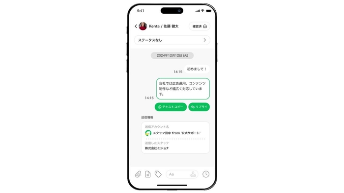 株式会社ミショナ提供のLINE公式アカウント拡張ツール「L Message(エルメッセージ)」は、スマホアプリでも利用可能。 外出中でもトーク内容や対応状況を確認したり、メッセージを送信したりできます。
